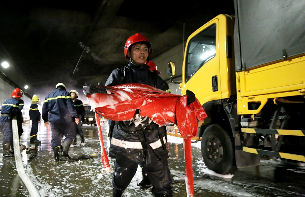 Các chiến sĩ thu trang thiết bị chữa cháy sau khi hiện trường vụ tai nạn được giải quyết.