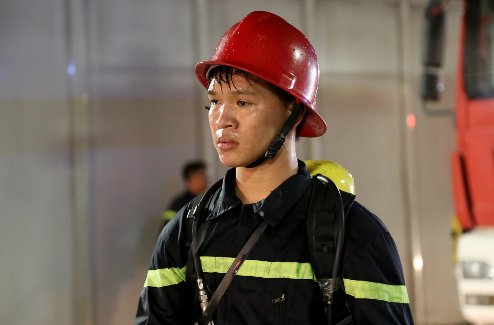 Sự mệt mỏi tỏ rõ trên gương mặt một chiến sĩ cảnh sát PCCC sau khi kết thúc diễn tập.