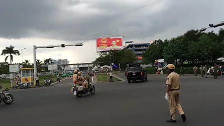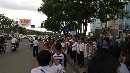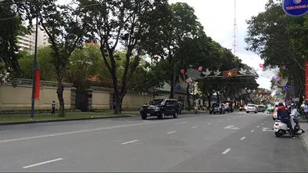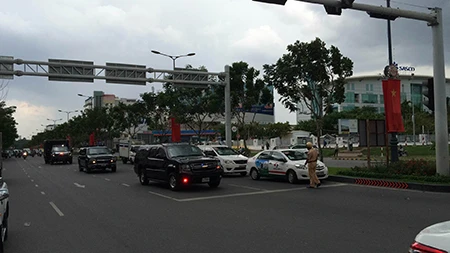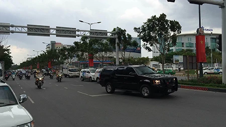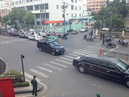 Lúc 13h giờ 10 phút, đoàn xe gồm hai chiếc Cadilac One xuất phát từ Lãnh sự quán Mỹ di chuyển đến sân bay để đón Tổng thống Obama. ẢNH :HOÀNG TUYẾT