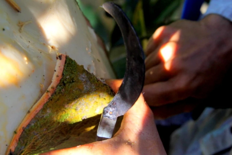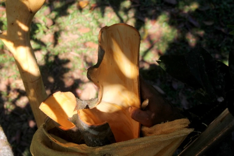 Các công đoạn lột vỏ quế rất đơn giản, chỉ cần một lưỡi liềm, dao nhọn, bao đựng.
