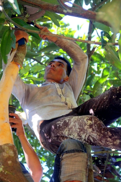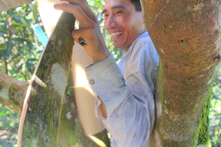 Sau khi bóc xong vỏ ở phần thấp thì người trồng quế dùng thang leo cây để bóc những phần ở phía trên cao hơn