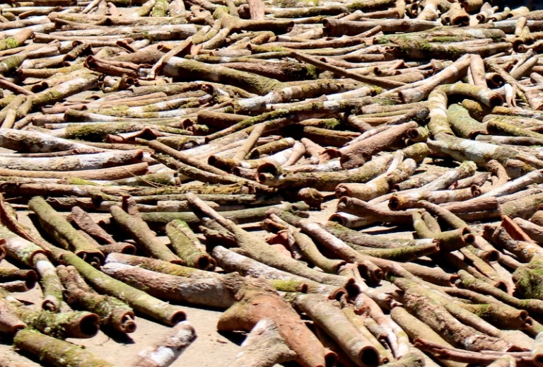Sau khi bóc vỏ, người trồng quế phơi nắng và thương lái sẽ đến thu gom