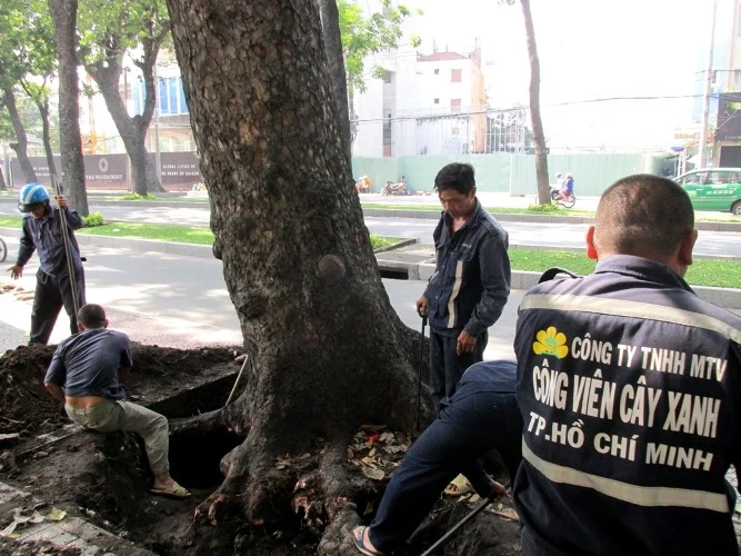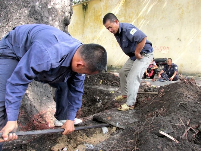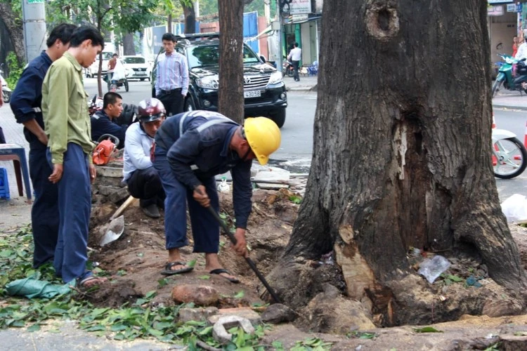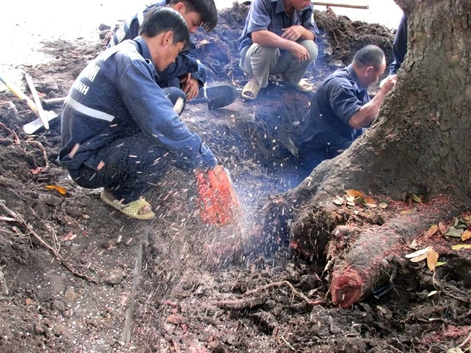 Gốc và rễ cây xà cừ rất to, các công nhân vất vả để đào bới và cắt sạch toàn bộ gốc rễ.