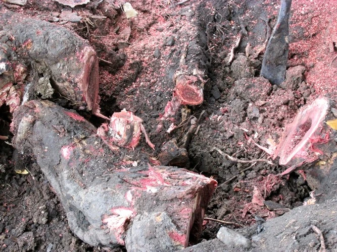 Các công nhân mất cả buổi sáng để dọn sạch các rễ cây, chuẩn bị cho việc kéo hạ.