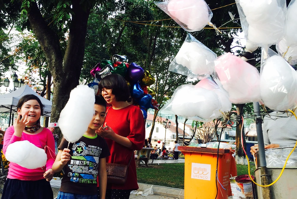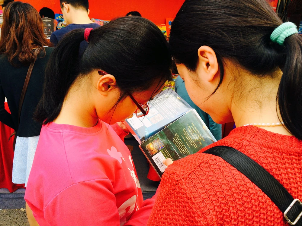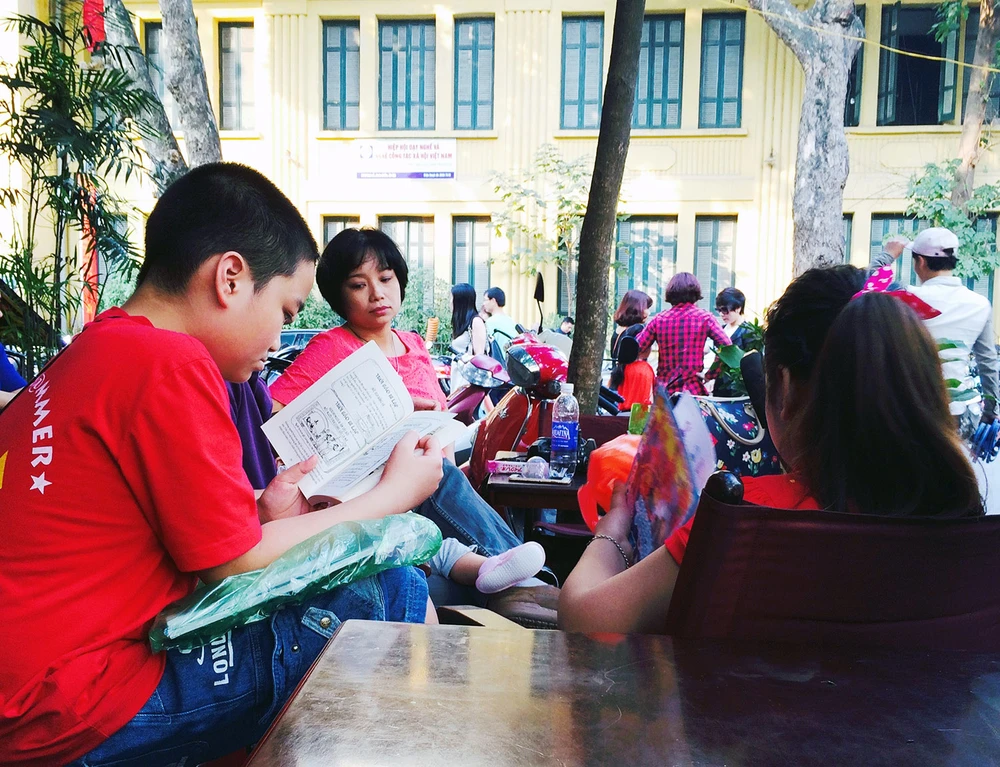 Hai bạn nhỏ dừng chân bên quán café thư thả xem những cuốn sách vừa mua cùng với gia đình.