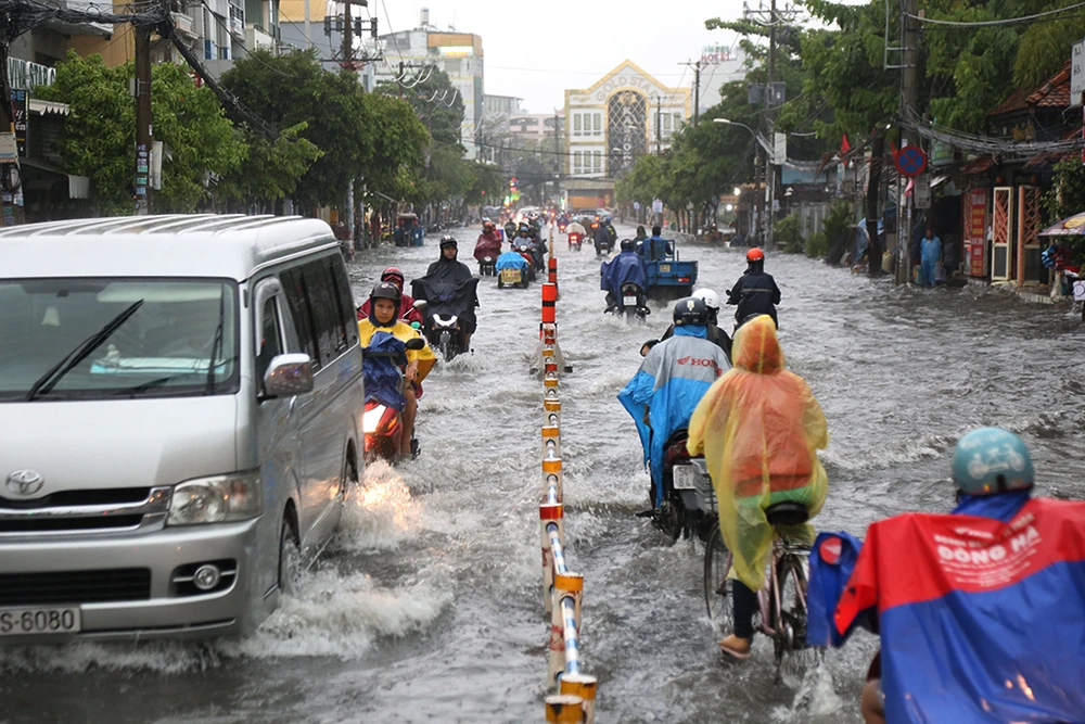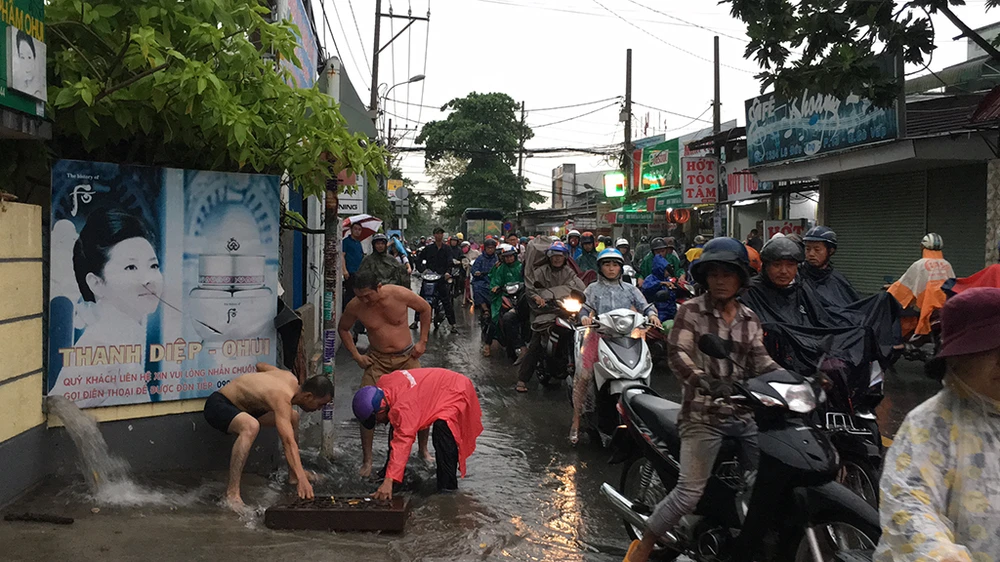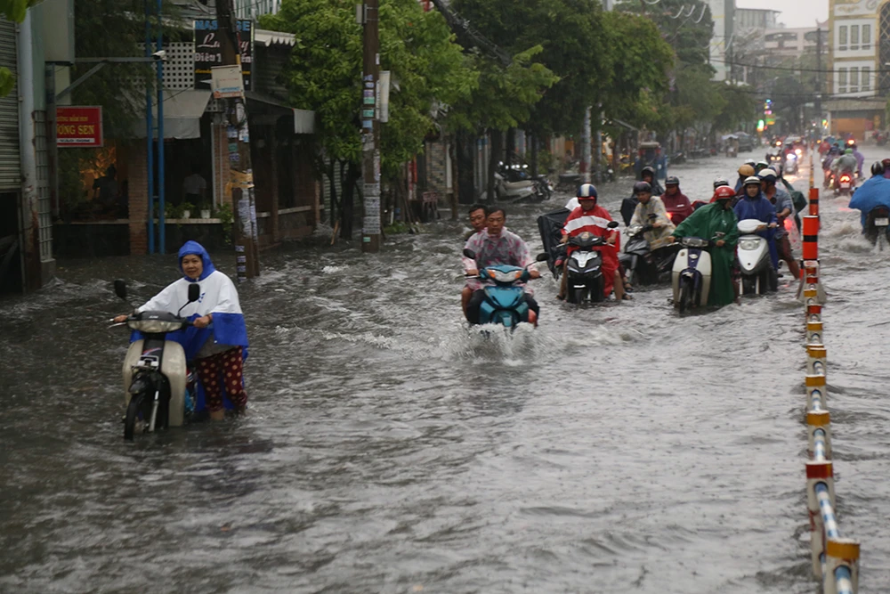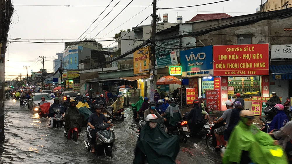 Giao thông trên đường Phạm Văn Chiêu (quận Gò Vấp) cũng gặp không ít khó khăn do mưa lớn.