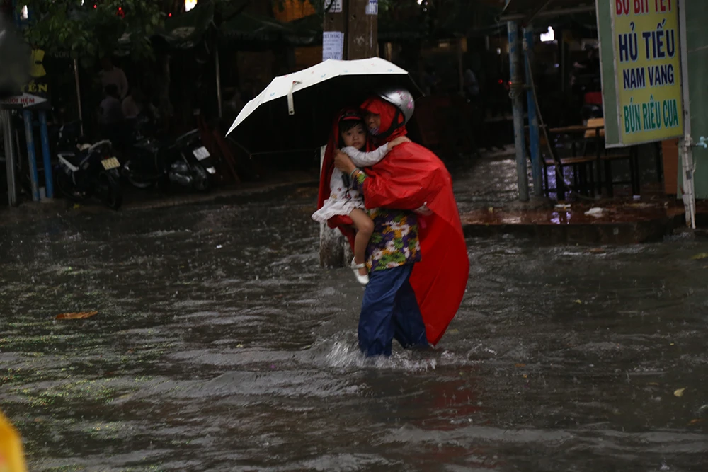 Mưa lớn, đường ngập đúng vào giờ tan tầm khiến nhiều phụ huynh gặp vất vả khi đón con.
