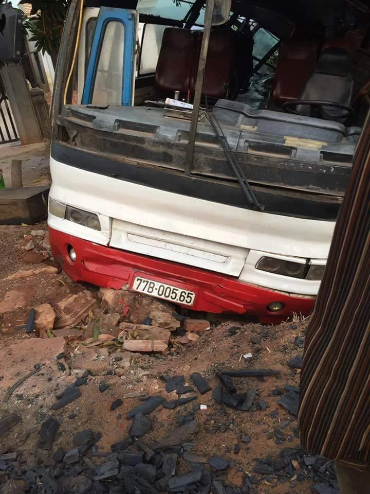 Sau cú tông xe khách nằm gọn trước hàng rào nhà người dân (Ảnh: CTV)