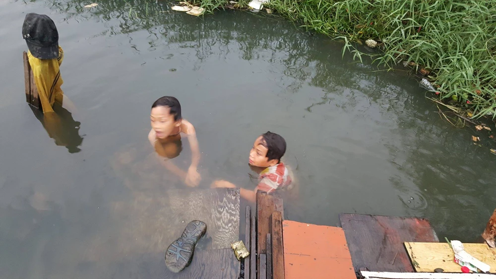 Thời điểm triều cường là lúc nước trong nhất đối với lũ trẻ. Chúng bơi như cá xung quanh nhà. Người lớn tắm giặt cũng trên dòng kênh này.