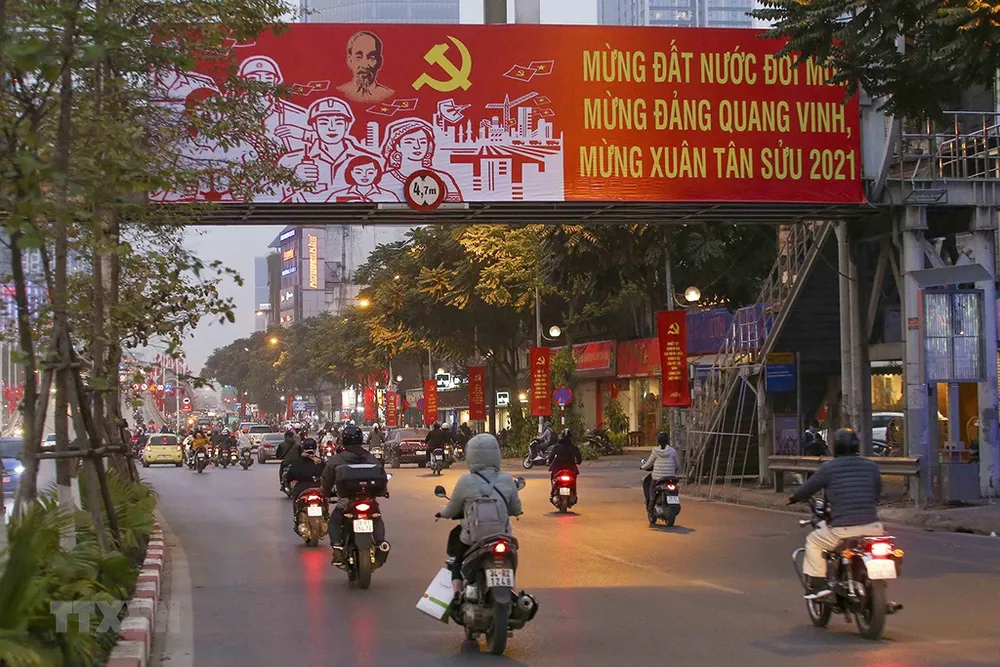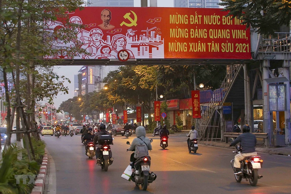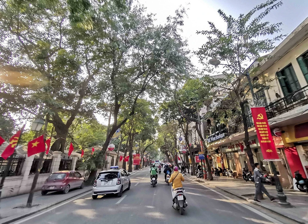 Cờ, băng rôn chào mừng Đại hội XIII của Đảng treo dọc hai bên phố Tràng Thi. Ảnh: TTXVN