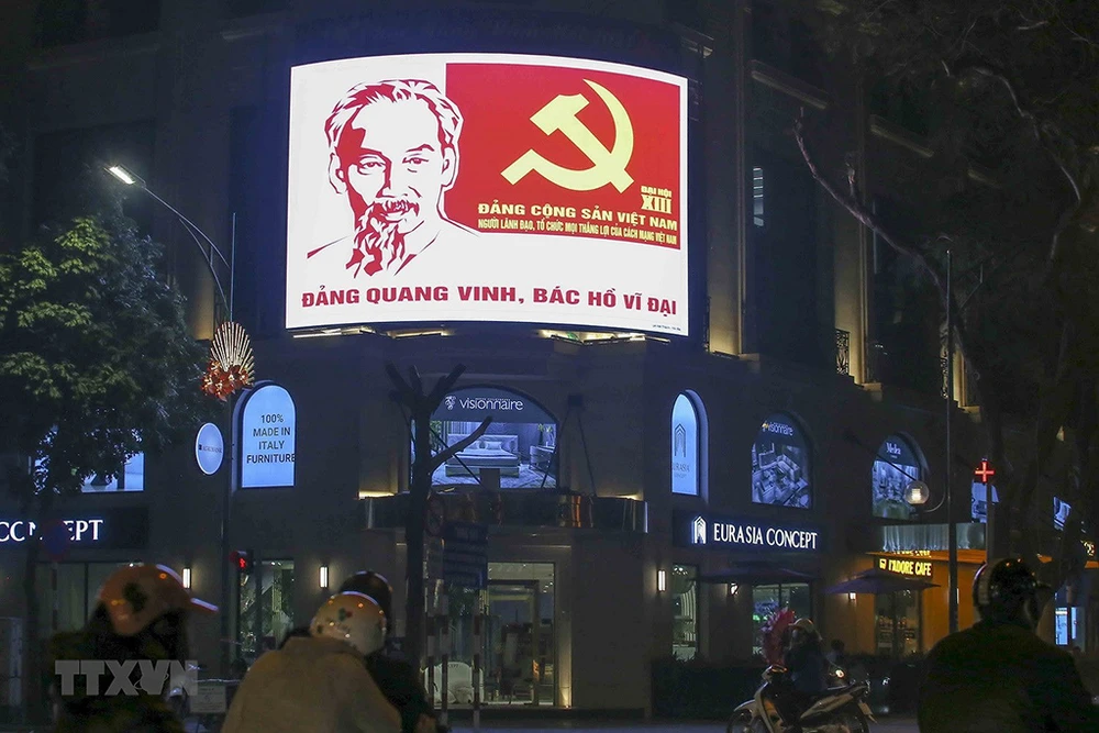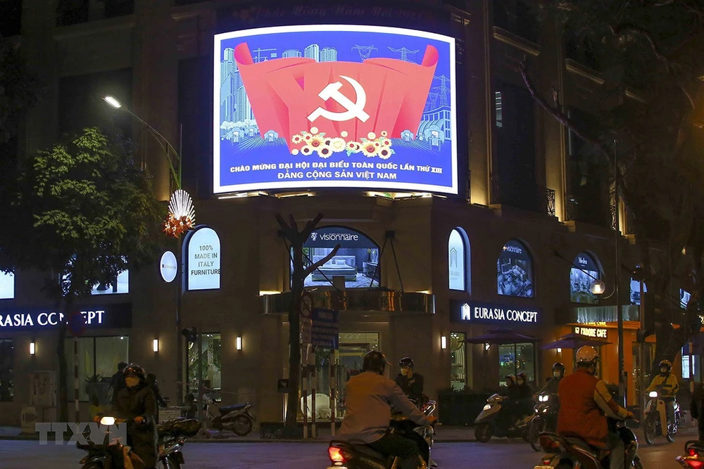 Vào buổi tối, một số tòa nhà cho bật các pano điện tử với khẩu hiệu chào mừng Đại hội XIII của Đảng. Ảnh: TTXVN