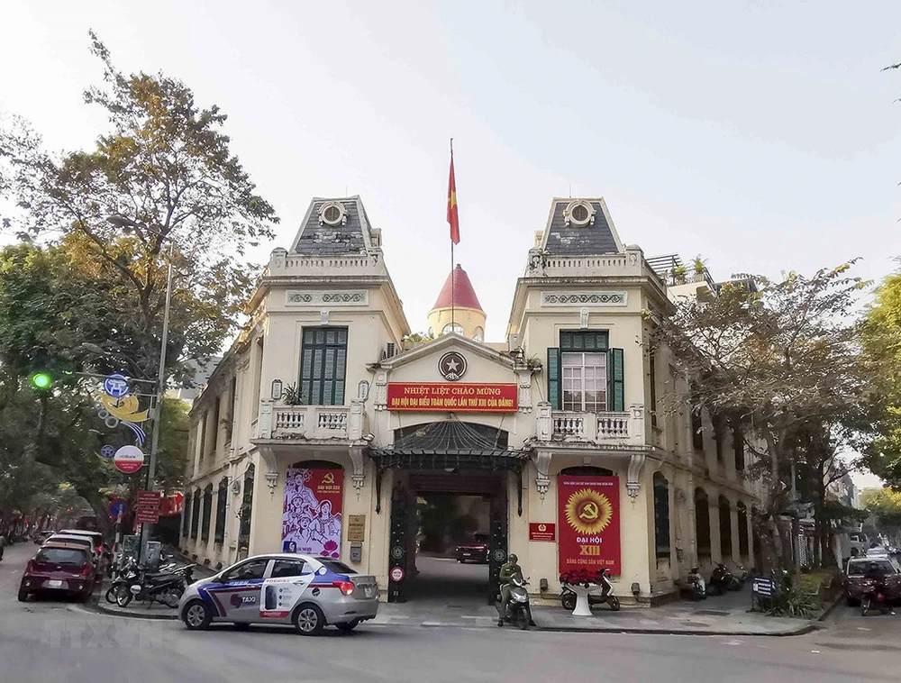 Trụ sở Công an quận Hoàn Kiếm được trang hoàng pano, khẩu hiệu chào mừng Đại hội XIII của Đảng. Ảnh: TTXVN
