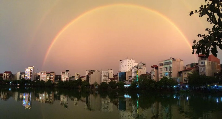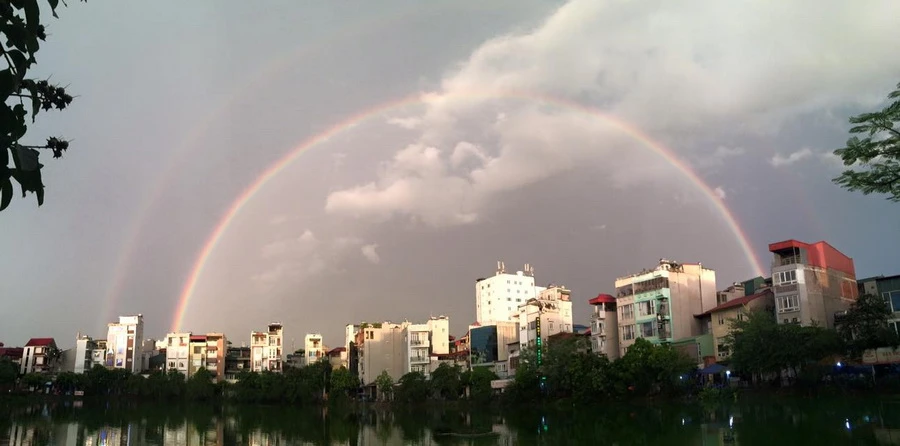 Khoảng 18g15 chiều 13-6, cơn giông đã ngừng. Sau cơn giông khủng khiếp, Hà Nội lại đón cầu vòng đẹp ngơ ngẩn. Ảnh: Nguyễn Tuấn Dũng