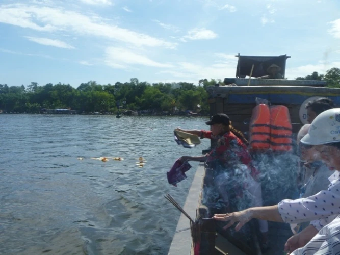 Không chỉ đốt vàng mã trên bờ, nhiều người tham gia lễ hội khi đang đi trên đò cũng rải vàng mã xuống dòng sông Hương.