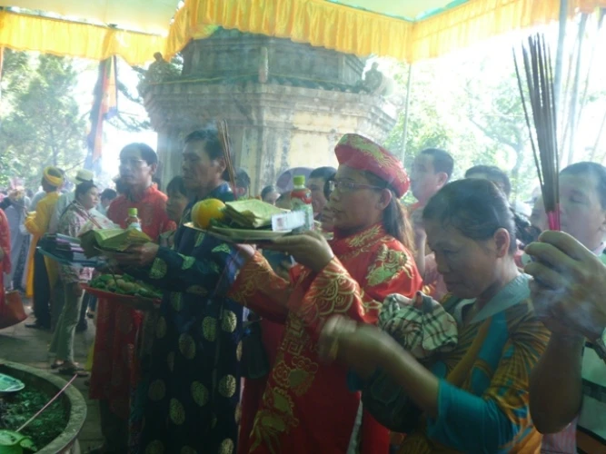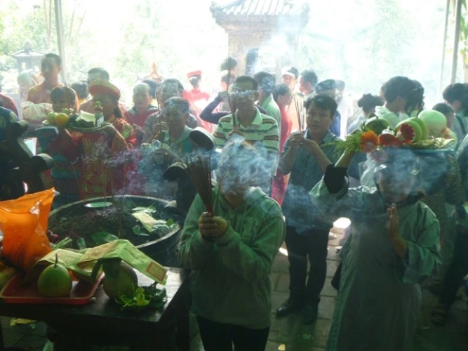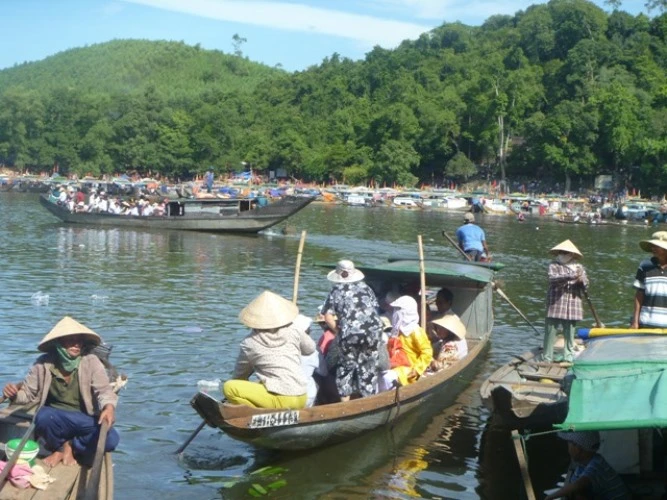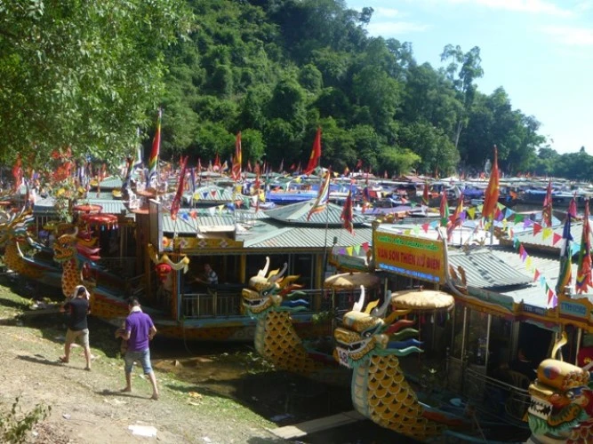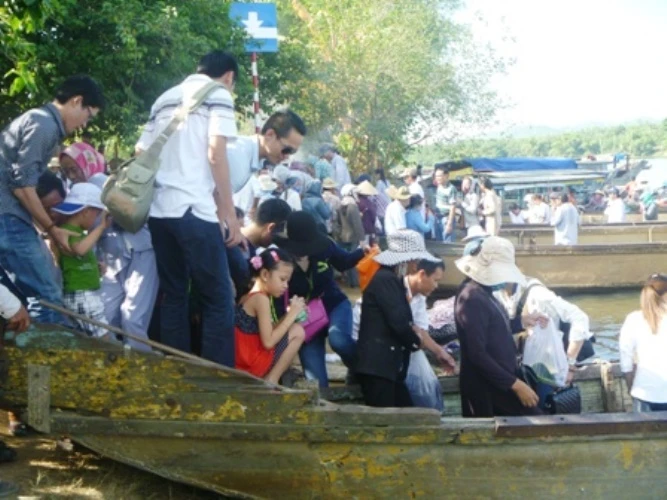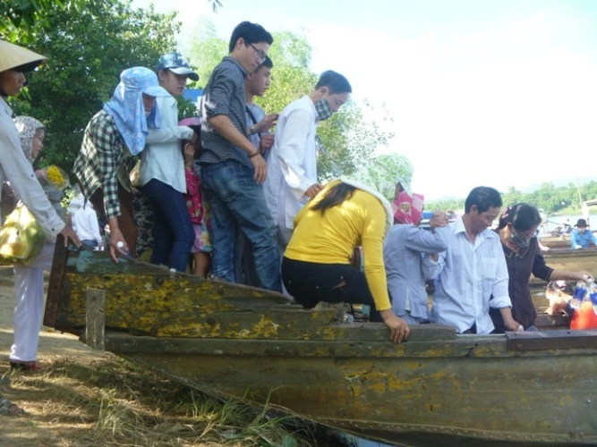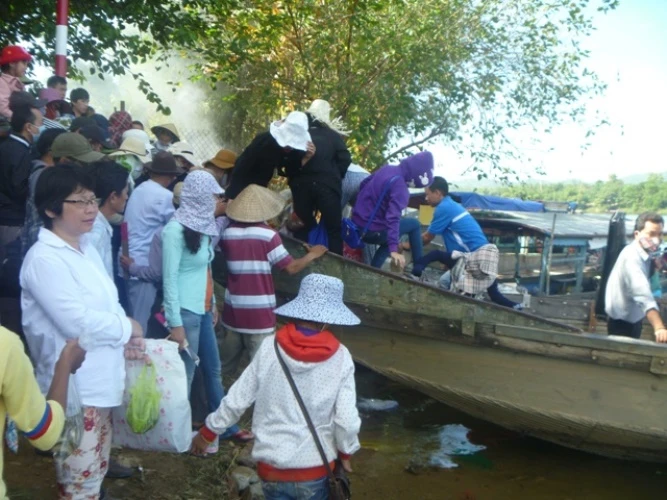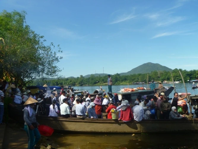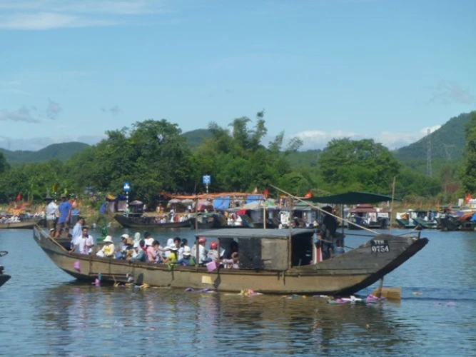 Có mặt tại lễ hội, cảnh tượng đập vào mắt là cảnh người dân và du khách thập phương với các lễ vật không thể thiếu là hoa quả, vàng mã chen chúc nhau lên đò từ bến Than để vượt sông Hương sang điện cầu lễ.