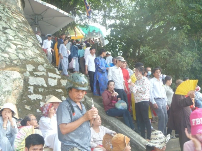 Bên trong khu vực điện Huệ Nam, cảnh người người mang hoa quả, vàng mã trên đầu, với bộ áo quần sặc sỡ chen chúc nhau vào điện để làm lễ.