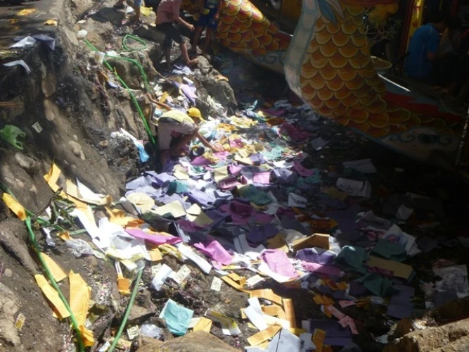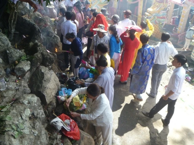 Người tham gia lễ hội quá đông đã bỏ quên ý thức trước những biển báo giữ gìn vệ sinh chung, ở đâu cũng thấy cảnh người dân và du khách thắp hương, đốt vàng mã.