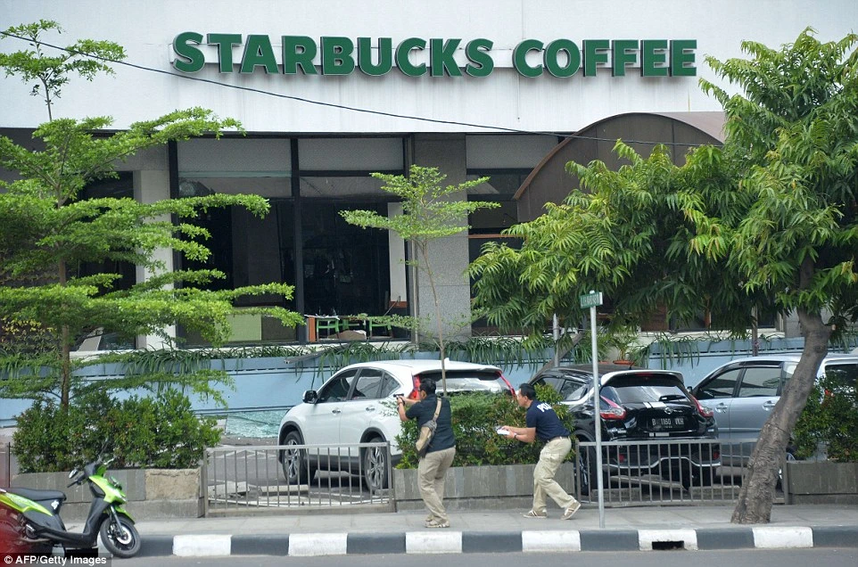 Một vụ nổ xảy ra ở quán cà phê Starbucks và sĩ quan cảnh sát nhanh chóng tiếp cận hiện trường. (Nguồn: Daily Mail)