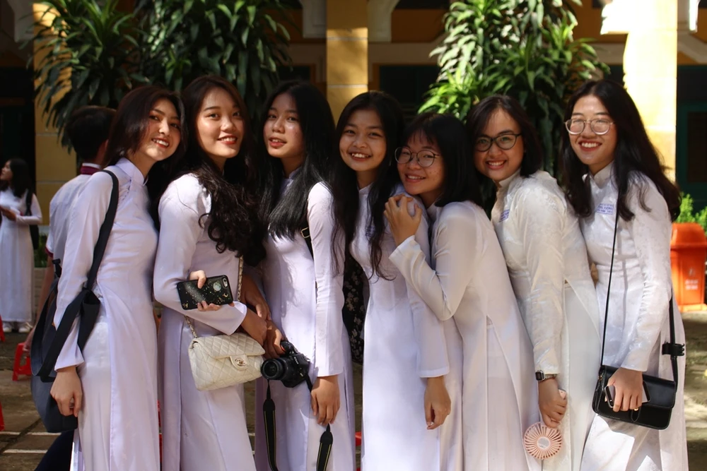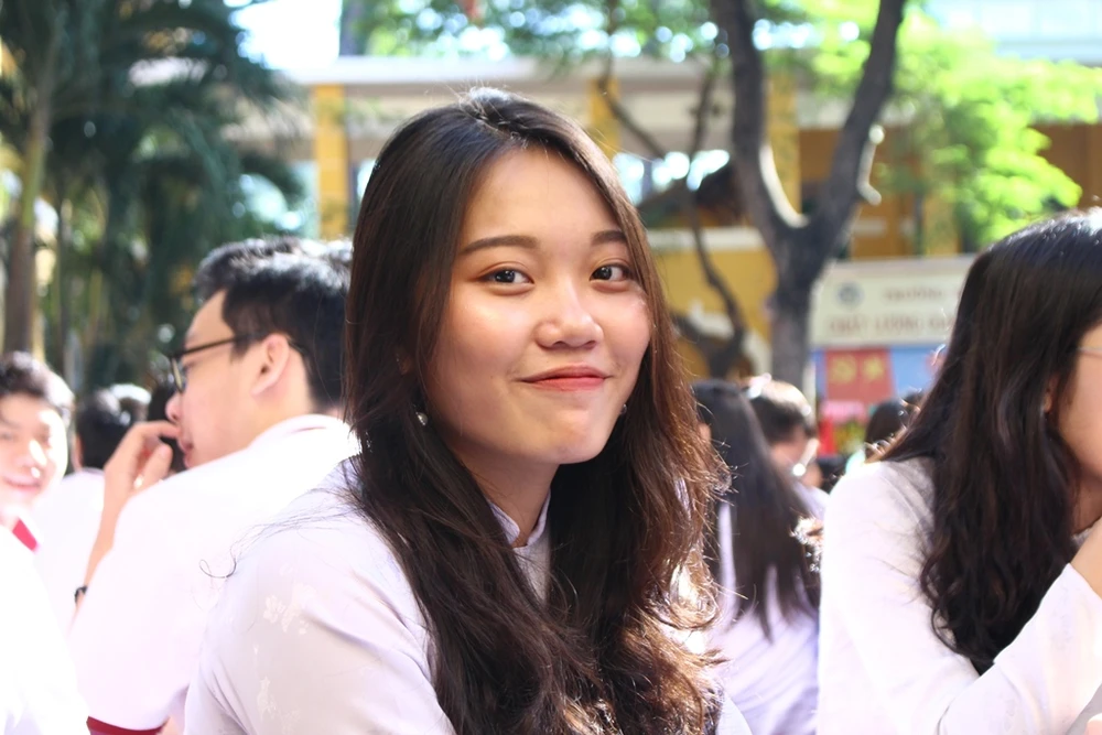 Nữ sinh Trường THPT Trưng Vương, quận 1 rạng rỡ trong lễ khai giảng.