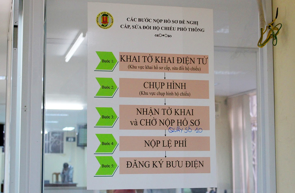 Các bước thực hiện làm hộ chiếu được dán khắp nơi tại Phòng Xuất nhập cảnh Công an TP.HCM, địa chỉ 196 Nguyễn Thị Minh Khai, phường 6, quận 3, TP.HCM.