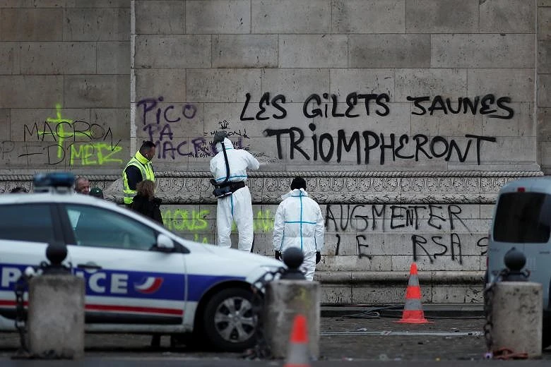 Một bức tường Khải Hoàn Môn bị bôi bẩn bởi những dòng chữ khiêu khích Tổng thống Macron. Ảnh: REUTERS