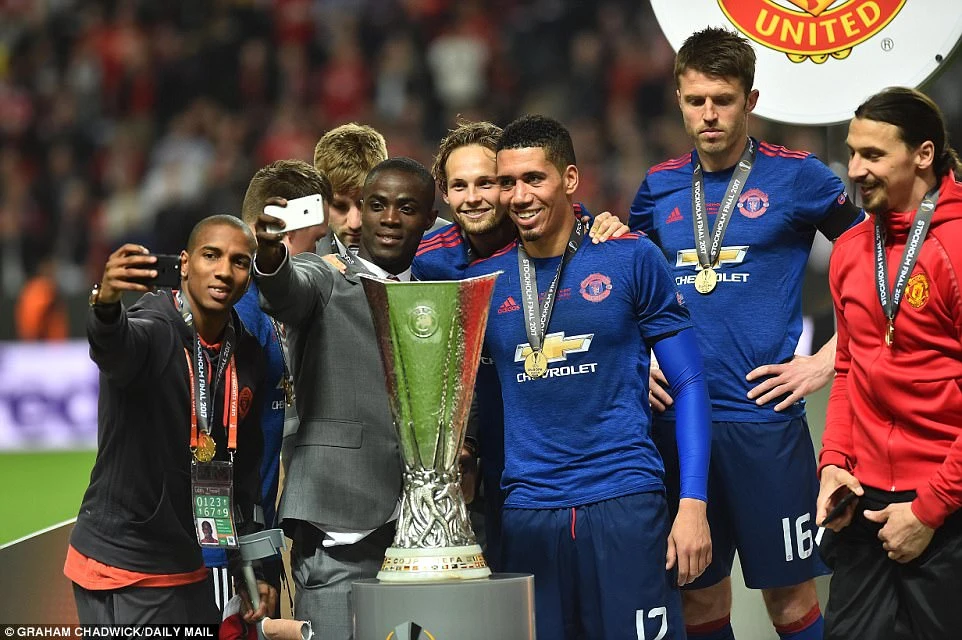 Các cầu thủ MU tiếp tục selfie bên chiếc cúp vô địch.
