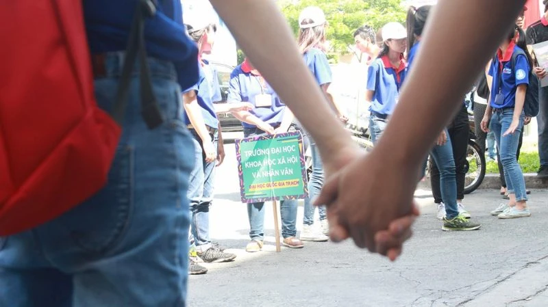Sinh viên tình nguyện nắm tay lập hàng rào trước điểm trường ĐH Khoa học Xã hội và Nhân văn TP.HCM