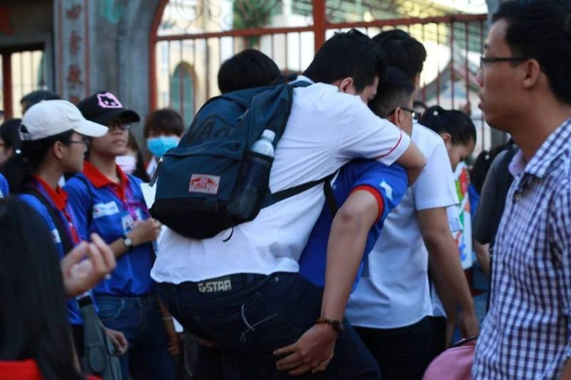 Sinh viên tình nguyện cõng một nam sinh bị thương ở chân vào khu vực thi
