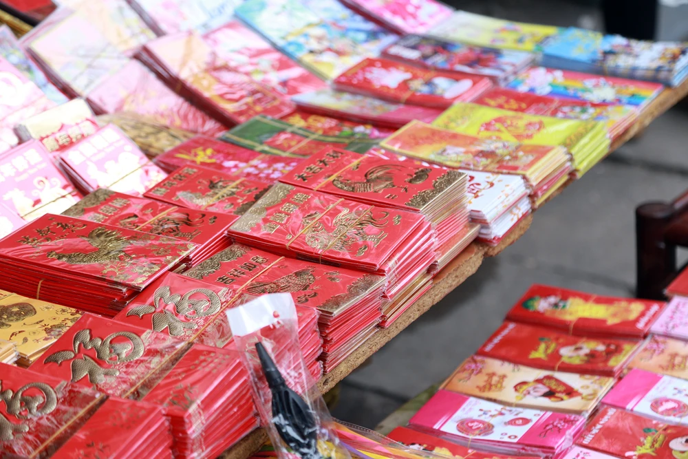 Những chiếc đèn lồng, đồ cúng, câu đối, phong bao lì xì... được bày bán dọc cả con phố.