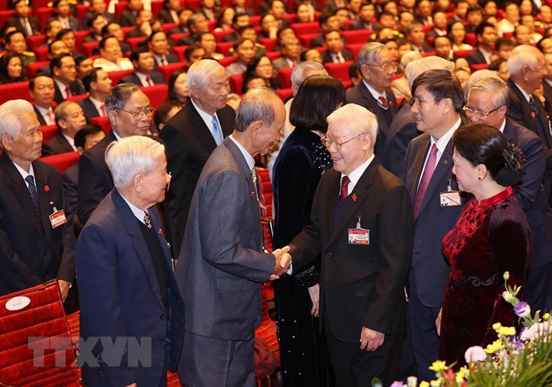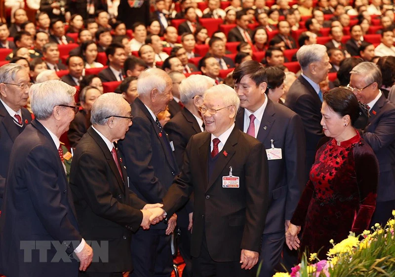 Tổng Bí thư, Chủ tịch nước Nguyễn Phú Trọng và Ủy viên Bộ Chính trị, Thủ tướng Chính phủ Nguyễn Xuân Phúc dự phiên khai mạc Đại hội. Ảnh: TTXVN