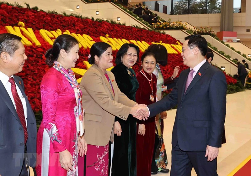 Nguyên Chủ tịch Quốc hội Nguyễn Sinh Hùng và bà Trương Thị Mai, Ủy viên Bộ Chính trị, Bí thư Trung ương Đảng, Trưởng ban Dân vận Trung ương, đến dự phiên khai mạc Đại hội. Ảnh: TTXVN