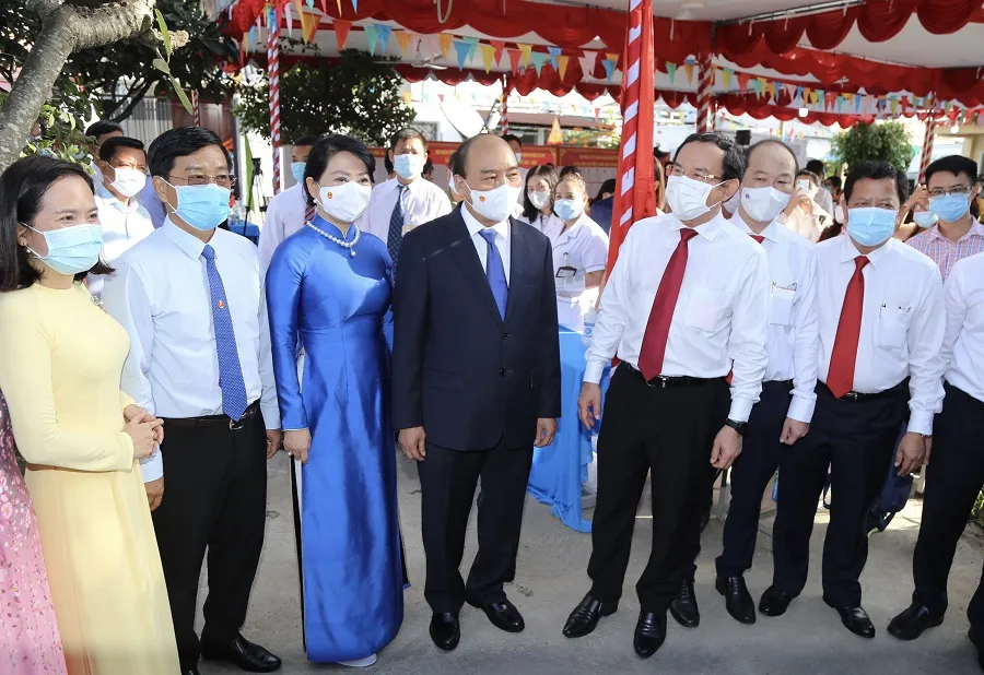 Bí thư Thành ủy TP.HCM Nguyễn Văn Nên trò chuyện với Chủ tịch nước trước giờ bầu cử. Ảnh: HOÀNG GIANG