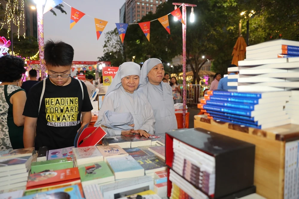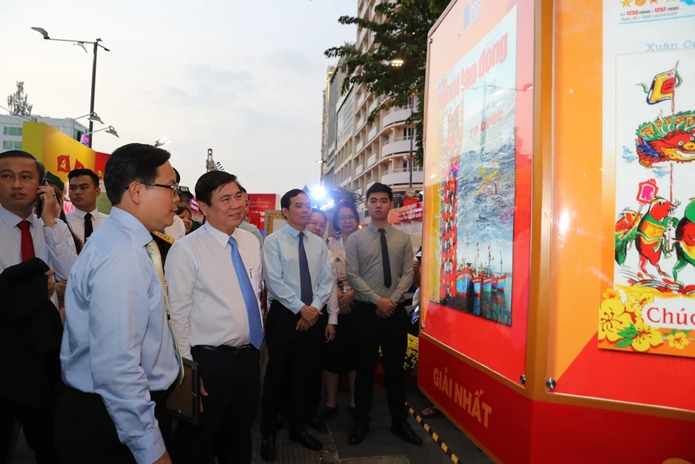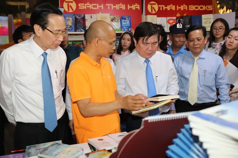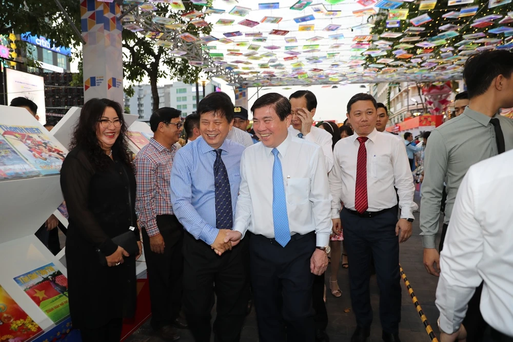 Phó Bí thư Thường trực Thành ủy TP.HCM Trần Lưu Quang, Chủ tịch UBND TP.HCM Nguyễn Thành Phong và nhiều lãnh đạo tham quan đường sách.