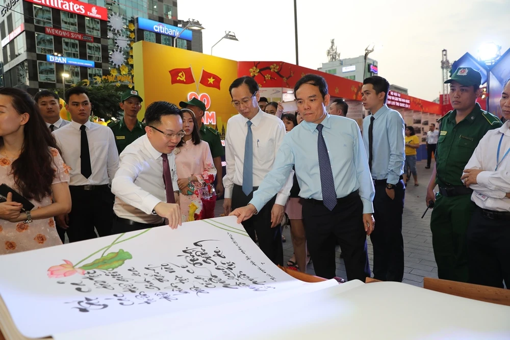Phó Bí thư Thường trực Thành ủy TP.HCM Trần Lưu Quang tham quan các cuốn sách được trung bày