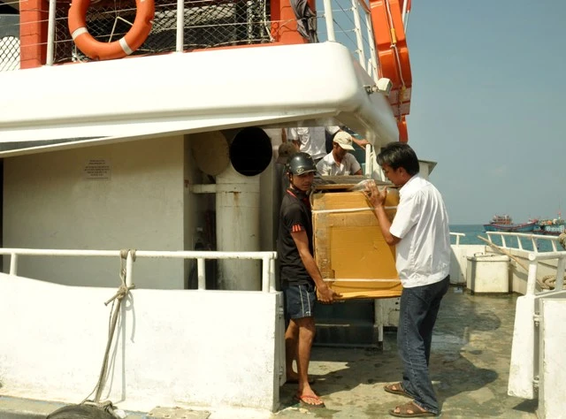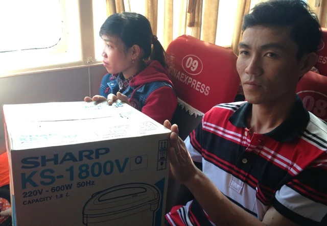 Trên tàu ra đảo Lý Sơn, vợ chồng anh Trần Văn Hiệp sinh sống ở thành phố Quảng Ngãi về thăm nhà còn khệ nệ ôm chiếc nồi cơm điện 1,8 lít để tặng cho người thân.