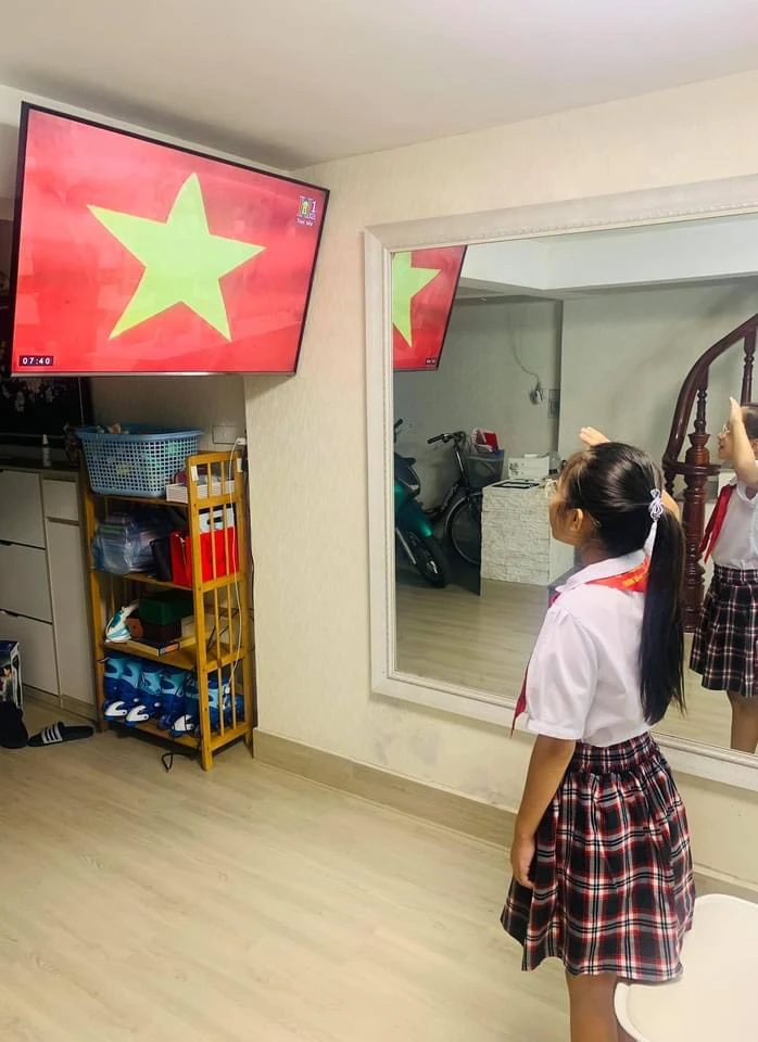 Học sinh Trường Tiểu học Lê Lai (Đà Nẵng) theo dõi Lễ khai giảng trực tuyến trong khu giãn cách mà gia đình đang tá túc. Ảnh: GDTĐ