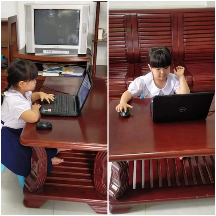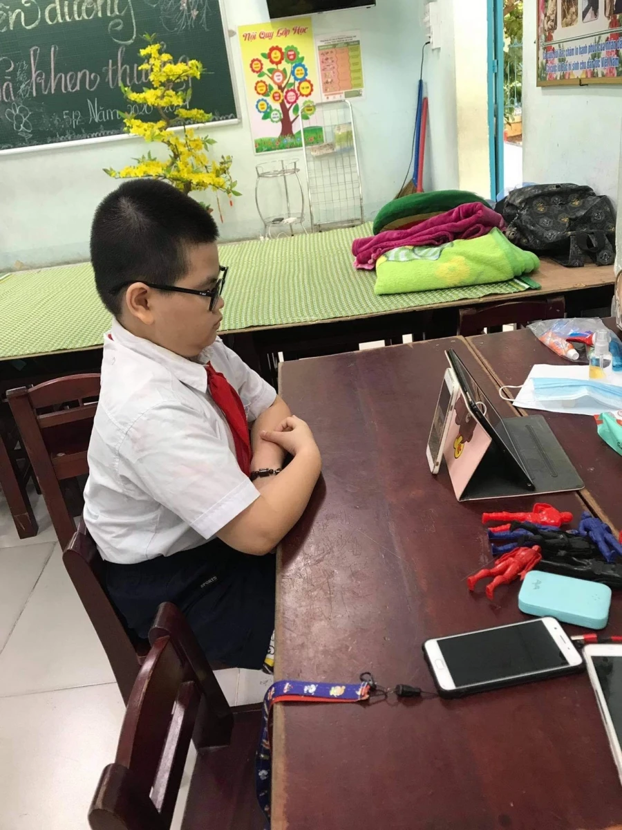 Em Phạm Khánh Huy (lớp 4A2 trường tiểu học Đặng Trần Côn, phường Thanh Xuân Bắc, quận Thanh Xuân, Hà Nội) dự lễ khai giảng trực tuyến tại Cao Bằng. Từ tháng 5-2021 em lên Cao Bằng ở với ông bà ngoại, do dịch nên đến nay vẫn chưa thể về Hà Nội. Việc thi học kỳ 2 và học online thời gian qua được ông bà kèm, hỗ trợ. Ảnh: KL