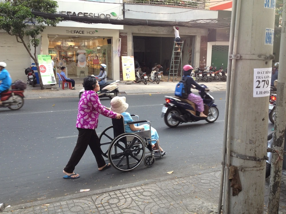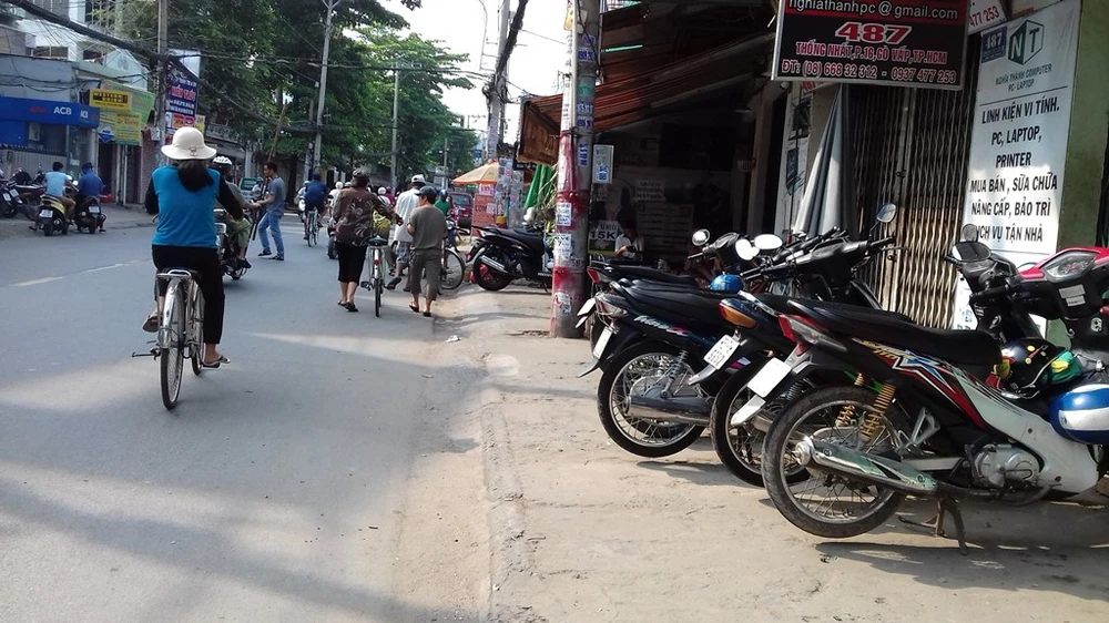 Vỉa hè bị lấn chiếm nên người đi bộ phải đi dưới lòng đường, ảnh chụp trên đường Cao Thắng Q3