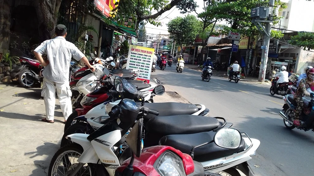 Giữ xe chiếm gần hết vỉa hè, ảnh chụp trước một quán cà phê trên đường Thống Nhất, Gò vấp