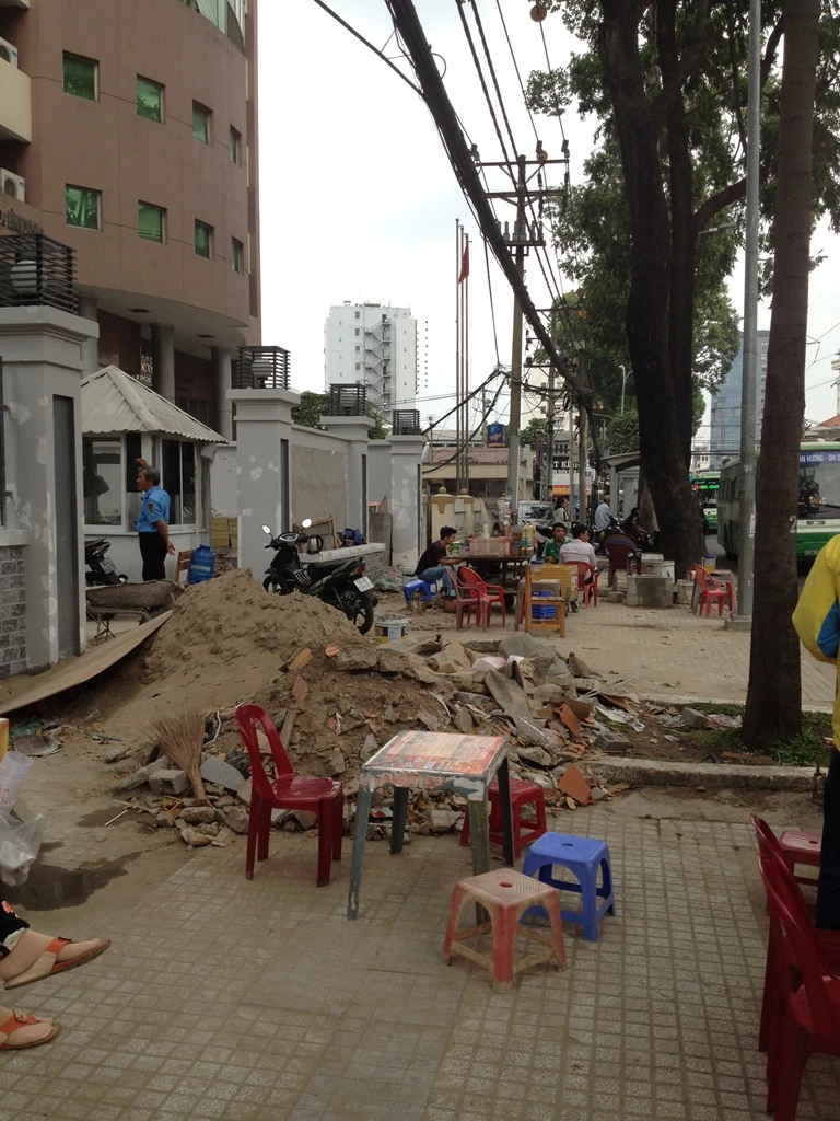 Vật liệu xây dựng và xà bần chiếm vỉa hè, ảnh chụp trên đường Điện Biên Phủ Q3