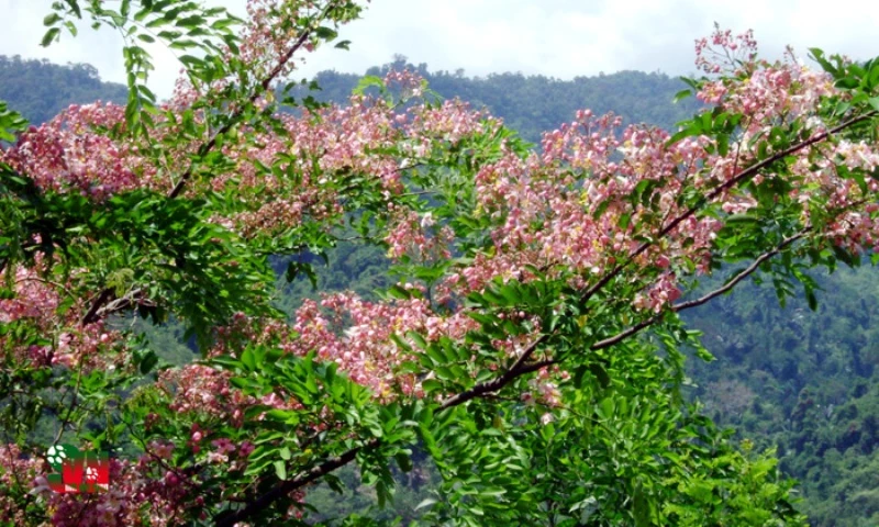 Đâu đó bên bờ suối, một vài vũng nước còn đọng lại sau cơn mưa đầu mùa bất chợt. Độ ẩm của đất đã đánh thức cây Muồng hoa đào cổ thụ tỉnh giấc sớm hơn. Có lẽ sau hàng nhiều chục năm tồn tại ở nơi đây, nó như cảm nhận được mùa mưa đang đến rất gần. Một mình, lặng lẽ nở từng chùm hoa rực hồng trong tán lá xanh.