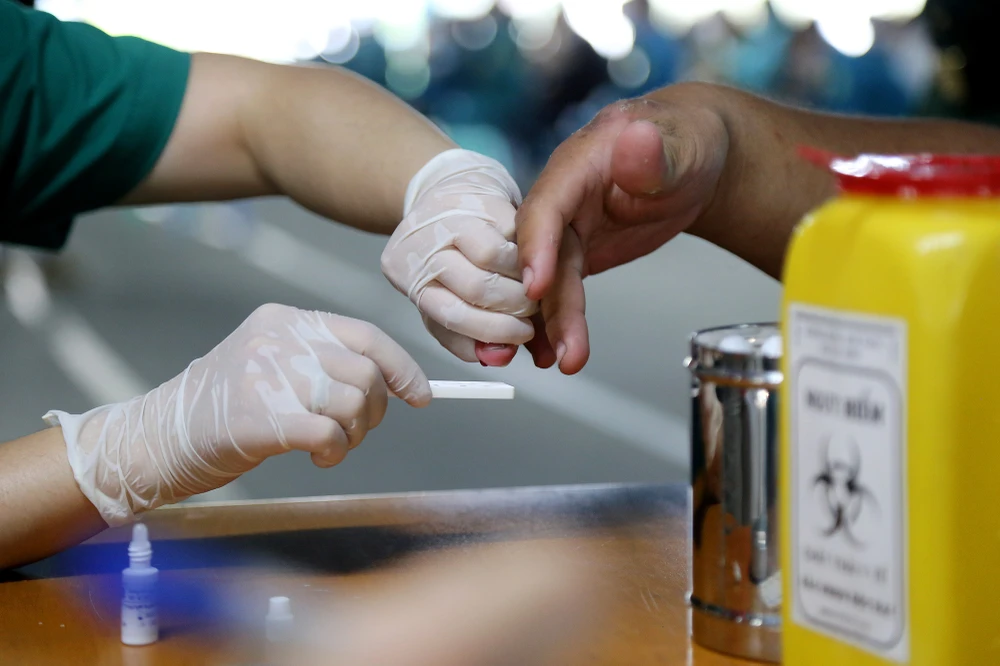 Tại điểm tiêm trường ĐH Công nghiệp TP.HCM tổ chức tiêm vaccine nhắc lại cho nhân viên y tế, cán bộ công an, quân đội, tổ COVID-19 cộng đồng. Người đến tiêm được lấy mẫu kiểm tra kháng thể.