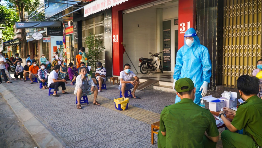 Sáng nay, các nhân viên y tế bắt đầu triển khai lấy mẫu xét nghiệm tại các khu dân cư. Trong ảnh: Lấy mẫu xét nghiệm các hộ dân tại đường Hoàng Hoa Thám (quận Thanh Khê). Ảnh: B.T