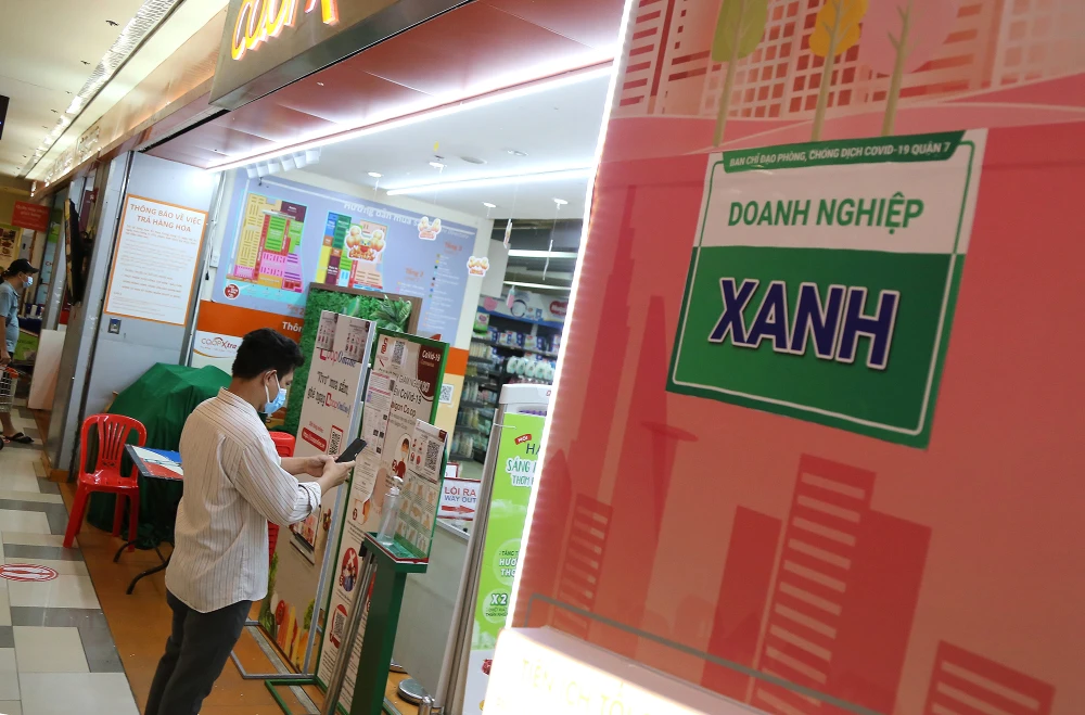 Để được đón khách trực tiếp đến mua hàng, siêu thị phải được Ban Chỉ đạo phòng, chống dịch Covid-19 quận 7 kiểm tra, thẩm định và dán biển công nhận “doanh nghiệp xanh”.