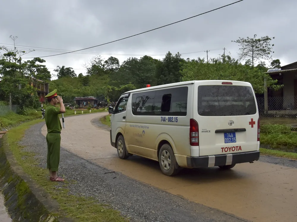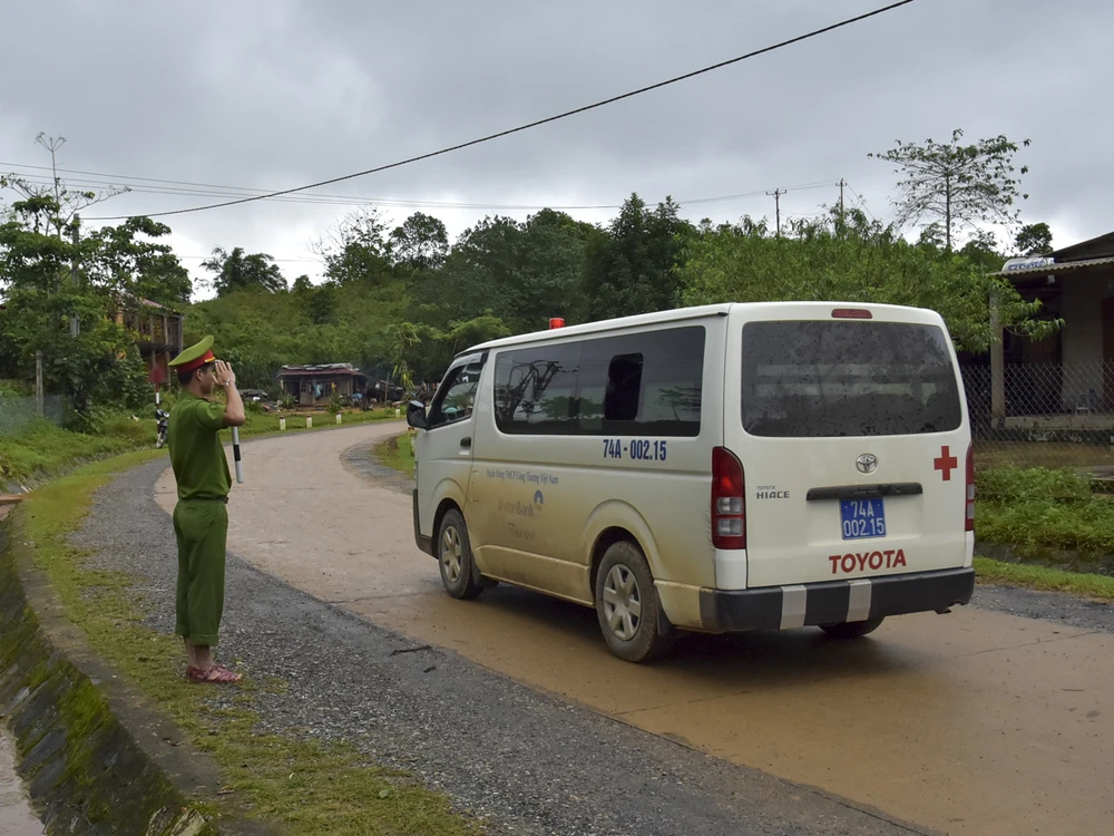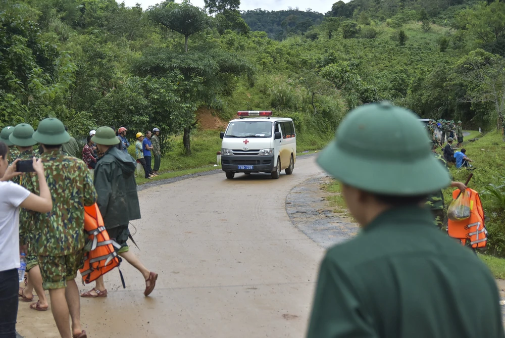 Sáng ngày 19-10, thi thể các cán bộ chiến sĩ Đoàn Kinh tế - Quốc phòng 337 được lực lượng chức năng dùng xe cấp cứu đưa về TP Đông Hà (Quảng Trị). Ảnh: Nguyễn Do