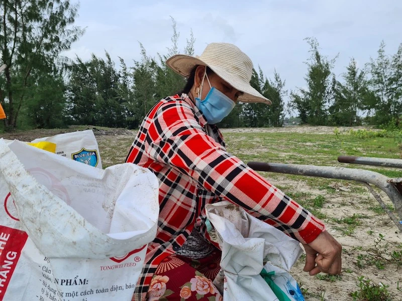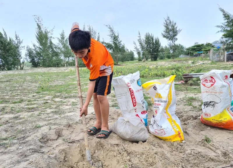 Phụ nữ, em nhỏ tranh thủ cùng ba mẹ xúc cát chằng nhà.