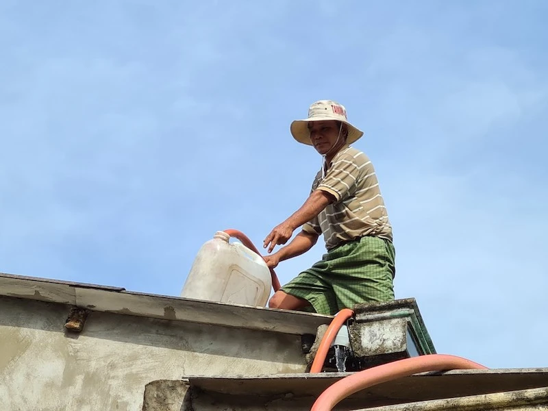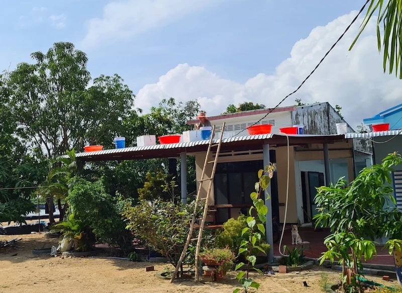 Bao cát, thùng xốp đựng nữa, xô nhựa được người dân tận dụng đưa lên mái nhà chằng chống.