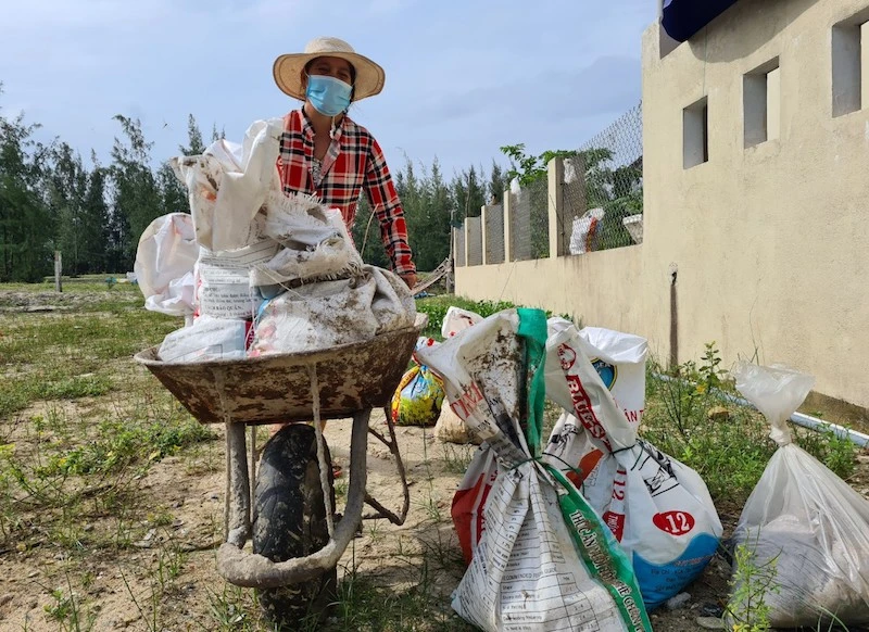 Tranh thủ chồng (cán bộ xã) đi kêu gọi, cô Hà ở nhà cùng con trai chuẩn bị bao cát, dây.