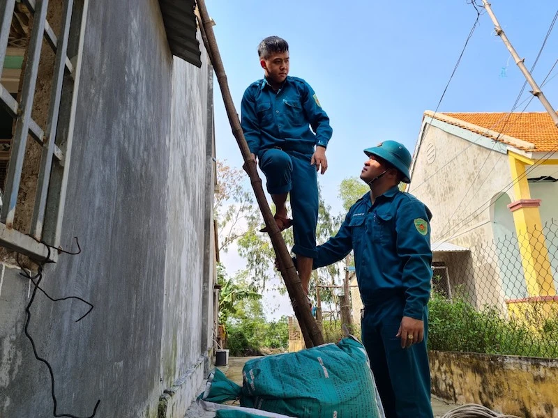 Lực lượng bộ đội, dân quân hỗ trợ người dân chằng chống nhà cửa. Ảnh: TN