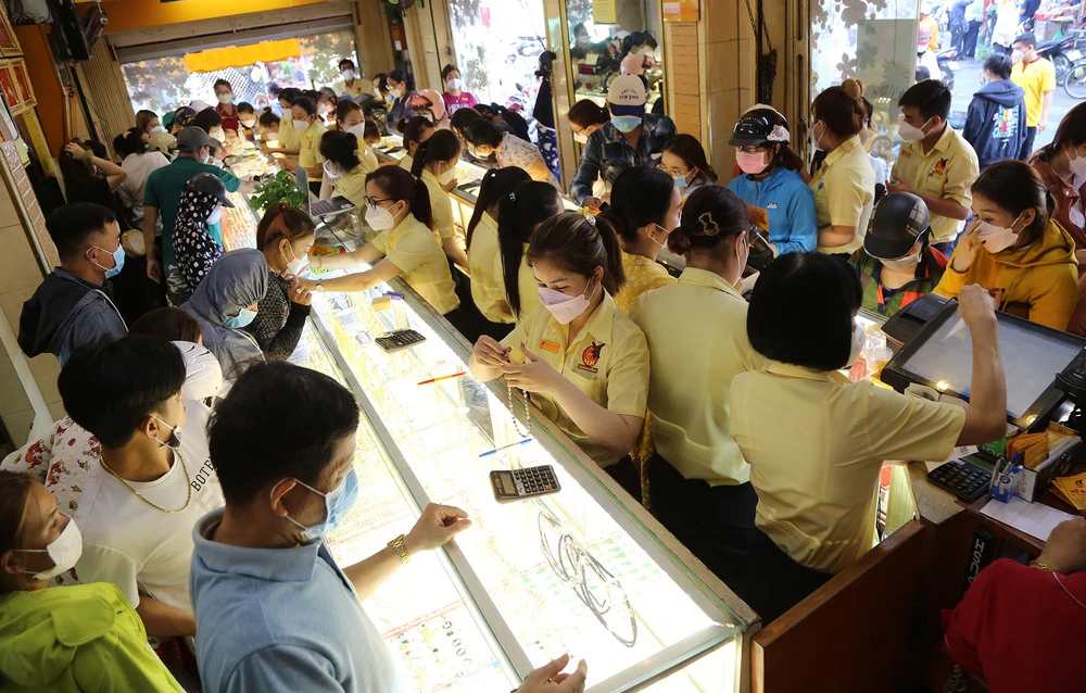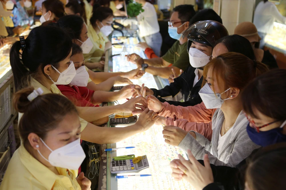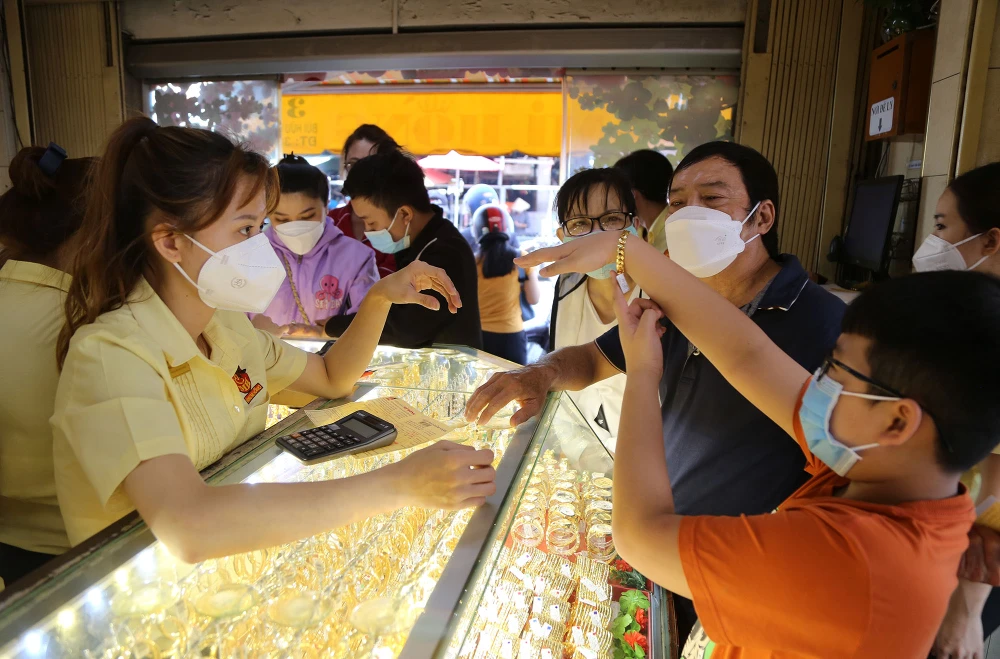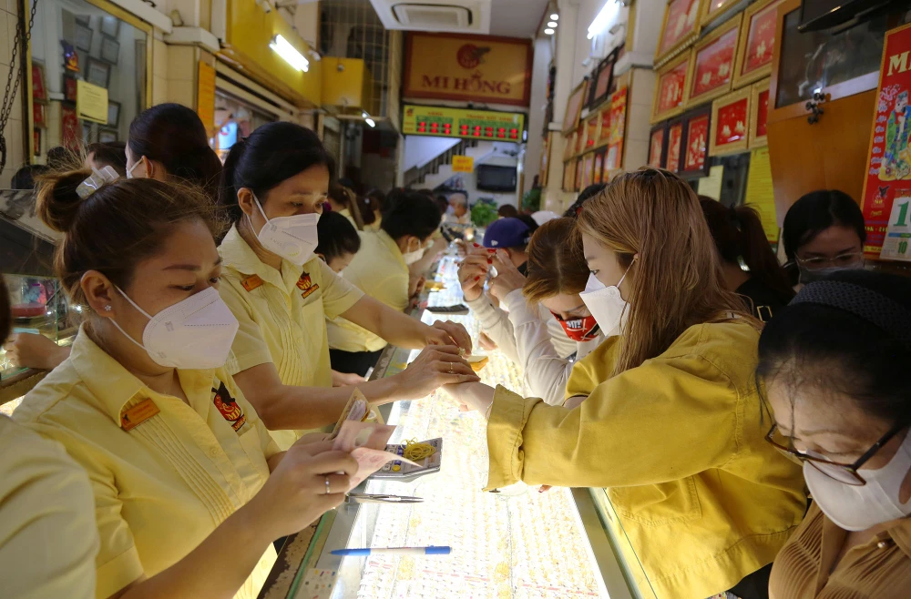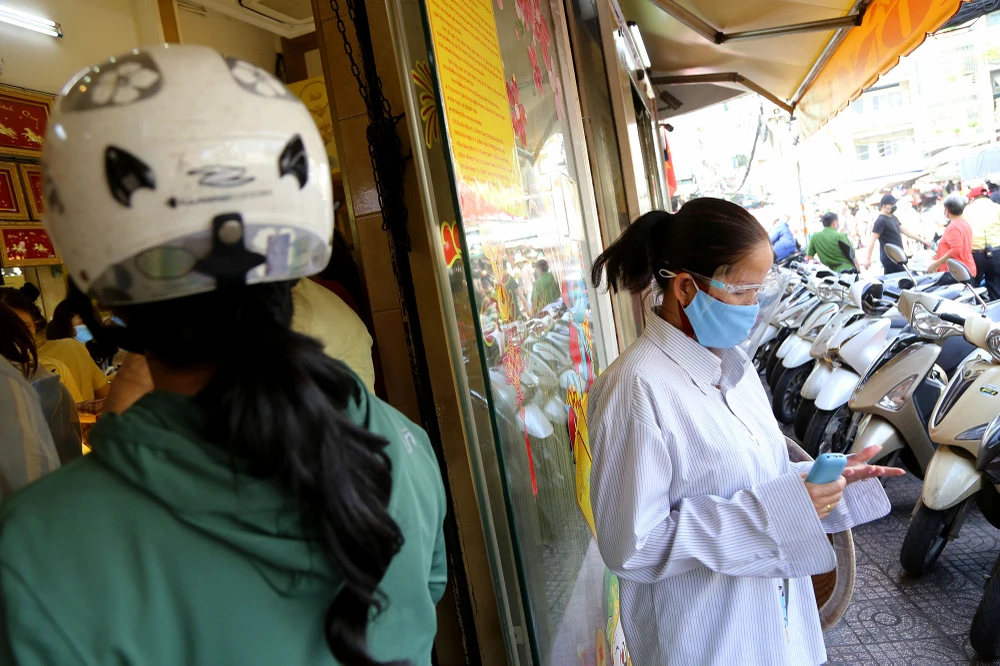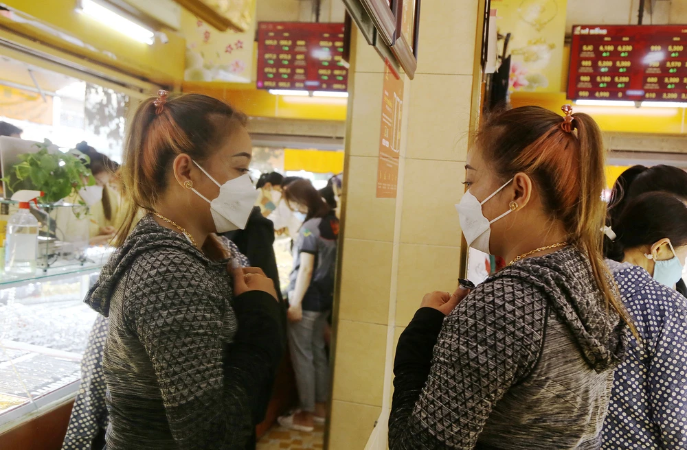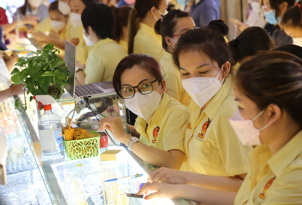 Ghi nhận của PV tại tiệm vàng Mi Hồng (đường Bùi Hữu Nghĩa, quận Bình Thạnh, TP.HCM) người dân chen chúc vào mua vàng mỗi lúc một đông.